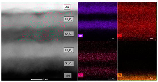 Cross sections of the laminated structures were studied using scanning transmission electron microscopy (STEM). This was carried out with the FEI Titan Themis 200 instrument with an electron gun operated at 200 kV. The device was equipped with a Bruker SuperX SDD Energy-dispersive X-ray spectroscopy (EDX) system. The EDX system was used for the elemental composition profiling of the SnO2-HfO2 nanolaminates. Electrical measurements were performed by using a Cascade Microtech EPS150TRIAX station, which was controlled by a voltage source and measuring device, namely Keithley 2636A. All electrical measurements were performed at room temperature.