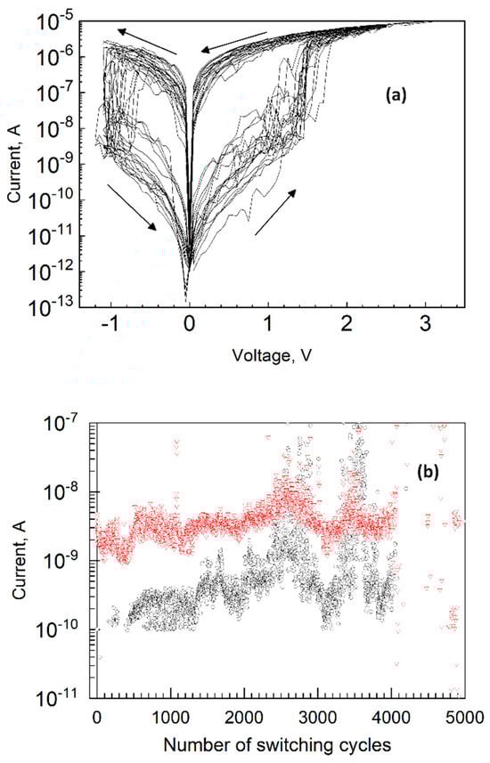 Current–voltage characteristic of a bipolar resistive switching device (a) and endurance graph (b), measured from a film deposited using a cycle sequence of 70 × HfO2 + 30 × SnO2 + 70 × HfO2. HRS and LRS data are marked with black and red circles, respectively. Upward arrows indicate the SET process and downward arrows indicate the RESET process.