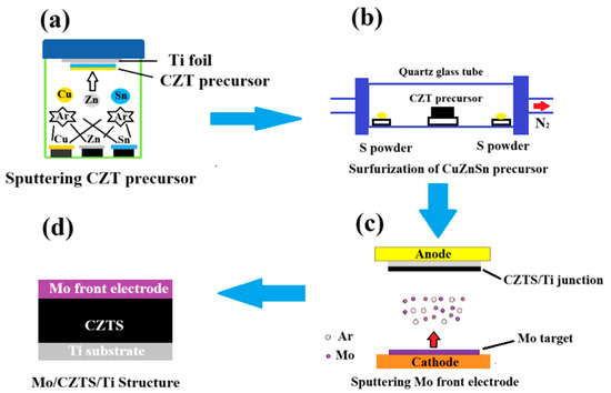 The preparation process of Mo/CZTS/Ti structure: (a) sputtering CZT thin films, (b) sulfurization of CuZnSn thin films, (c) sputtering Mo front electrode, and (d) Mo/CZTS/Ti structure.