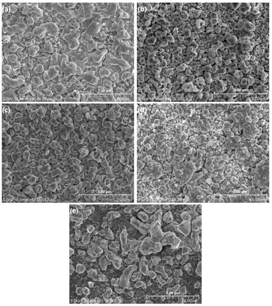 The surface SEM images of CZTS thin films with various sulfurization temperatures: (a) 400 °C, (b) 450 °C, (c) 500 °C, (d) 550 °C, and (e) 600 °C.