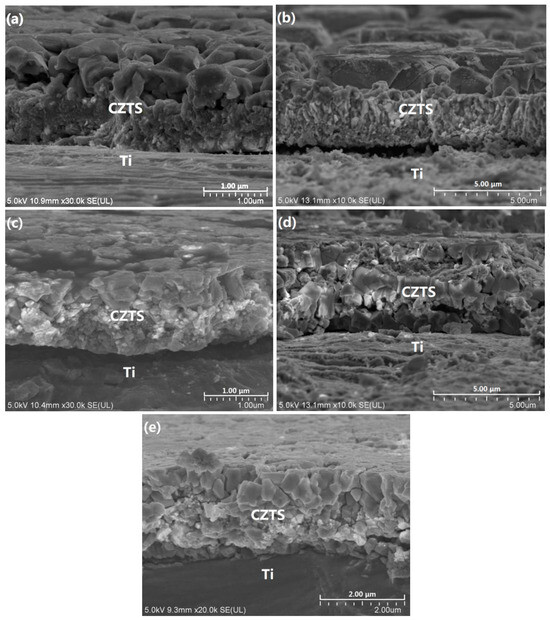 The cross-sectional SEM images of CZTS thin films heat-treated at different sulfurization temperatures: (a) 400 °C, (b) 450 °C, (c) 500 °C, (d) 550 °C, and (e) 600 °C.