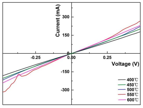Figure 5 shows the I–V curves of the CZTS/Ti structures prepared at different sulfurization temperatures. It can be observed that the I–V curves of the five samples are linear, indicating that an ohmic contact was formed between the CZTS thin films and the Ti substrate. The slopes of the I–V curves for the CZTS/Ti structures prepared at sulfurization temperatures of 400 °C, 450 °C, 500 °C, 550 °C, and 600 °C are 0.37 S, 0.42 S, 0.46 S, 0.55 S, and 0.50 S, respectively. When the sulfurization temperature of the sample increased from 400 to 550 °C, the slope of the I–V curve of the CZTS/Ti structure increased, indicating better ohmic contact characteristics between the CZTS thin films and Ti foils. When the sulfurization temperature of the sample increased from 550 °C to 600 °C, the slope of the I–V curve of the CZTS/Ti structure decreased. Therefore, it can be seen that at a sulfurization temperature of 550 °C, the CZTS/Ti structure exhibited the best I–V characteristic curve with the lowest resistance, which is beneficial for the transport of carriers between the CZTS thin films and the Ti substrate. The formation of the best ohmic contact between the CZTS thin films and Ti foil may be attributed to the appropriate diffusion of Ti elements within the CZTS thin films.