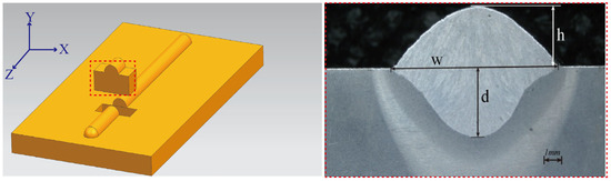 Schematic diagram of welded seam section and measurement position, where d, w, and h represent the weld depth, weld width, and weld height, respectively.
