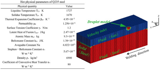 To improve the computational efficiency and save costs, it is necessary to simplify the model reasonably while highlighting the main research points. Therefore, the following simplifications and assumptions are made when establishing the droplet–molten pool coupling model [26,27,28,29,30,31,32]: