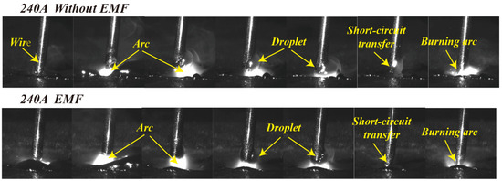Since the current inside the droplet and molten pool inevitably has a radial component, the Lorentz force generated by the current and the LMF will have an influence on the liquid metal flow. As shown in Figure 7e, compared with the welding without an EMF at the same time, the radial movement of the liquid metal is obviously accelerated after the LMF is applied, and the LMF has a stirring effect on the liquid metal. Since the CO2 welding arc is always below the droplet, it will deviate from the wire axis direction without the EMF. By applying an LMF, the droplet can produce circumferential motion. The behavior of the deviation from the wire axis is improved, which makes the transfer more controllable.