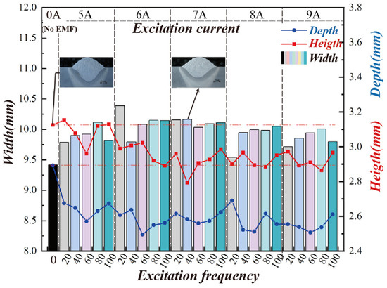 The change in the weld size under different magnetic field parameters. The red dotted line and the blue dotted line represent the weld depth and the weld height, and the bar graph represents the weld width, where the same color of the bar graph represents the same excitation frequency. In particular, the leftmost black bar represents the weld parameters without the EMF.