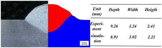 Based on the above experimental results, the numerical simulation is performed to explain the differences in the droplet and molten pool with and without the EMF. To verify the accuracy of the simulation results, it is essential to compare the simulation with actual welding results. As shown in Figure 6, it can be seen that the measured value of the penetration ratio obtained using numerical simulation is slightly shallow, and the measured value of the width and height ratio is slightly smaller. The error between the melting width of the actual and simulated welds is about 4%, the error in the residual height is about 7%, and the melting depth error is about 9%. Therefore, it can be considered that the laws obtained using numerical simulation are basically consistent with the actual weld morphology, which confirms the accuracy of the numerical simulation.
