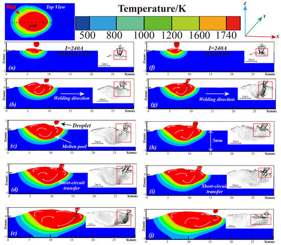 Temperature and flow field distributions in the longitudinal section of the molten pool at different moments (no magnetic field on the left, an EMF applied on the right, with Y = 0 mm). (a,f) t = t0 + 0.05 s, (b,g) t = t0 + 0.30 s, (c,h) t = t0 + 0.50 s, (d,i) t = t0 + 0.60 s, and (e,j) t = t0 + 1.00 s.