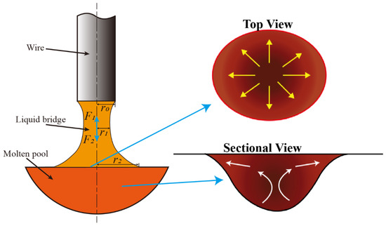 Force analysis of short-circuit liquid bridge and schematic diagram of molten pool flow. r0 is the radius of the welding wire; r1 is the minimum interface radius after necking of the liquid bridge; r2 is the radius of the contact surface between the liquid bridge and the molten pool.