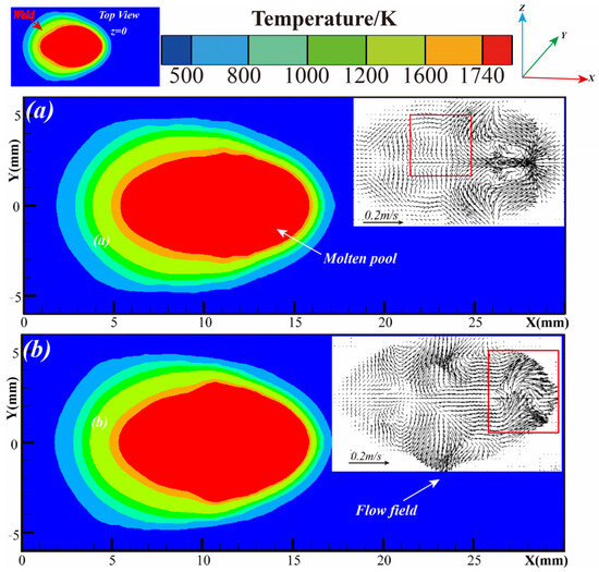 The temperature and flow field distribution of the molten pool on the surface of the workpiece (Z = 0 mm) after applying the LMF are shown in Figure 9. The radial motion of liquid metal is obviously enhanced after the LMF is applied, which increases the weld width. The higher current density in the pool results in the liquid metal by the magnetic field effect being more obvious and an overall clockwise direction of the flow trend. Under the same magnetic field conditions, when the arc plasma around the direction of the wire axis undergoes a clockwise spiral movement, the LMF arc will further produce a stirring effect on the molten pool. The electromagnetic stirring effect of the magnetic field on the pool has a certain effect on the weld size and organizational properties.