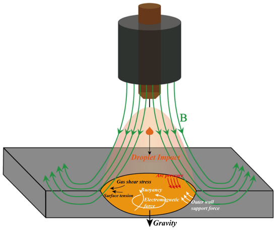 As shown in Figure 10, the flow of metal after the application of an LMF is mainly subject to the following forces: buoyancy, gravity, surface tension, gas shear stress, and electromagnetic forces exist inside the molten pool. On the outside, there is arc pressure, droplet impact force, and outer wall support force. The influences of gravity, droplet impact, and arc pressure mainly change the weld depth. The buoyancy force and the outer wall support force also have an effect on the weld depth, and the effect is opposite to the above three forces. The influence of gas shear stress and surface tension on the weld is reflected in the increase in the melt width. Electromagnetic force promotes the flow of metal inside the pool and has a greater effect on the heat and mass transfer between the top and bottom in the center of the pool.