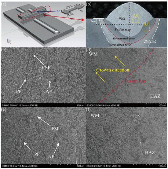 Schematic diagram of the position. (a) Overall view. (b) SEM sampling position. (c) Microstructure of the weld without an EMF. (d) Microstructure of the weld–fusion junction without an EMF. (e) Microstructure of the weld with an EMF. (f) Microstructure of the weld–fusion junction with an EMF.