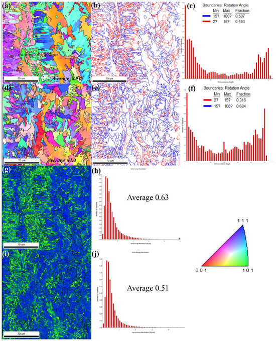 EBSD analysis of weld zone: (a) no EMF IPF, (b) no EMF size angle grain boundary distribution, and (c) no EMF orientation angle distribution; (d) EMF IPF, (e) EMF size angle grain boundary distribution, and (f) EMF orientation angle distribution; (g) no EMF KAM and (h) no EMF KAM distribution; and (i) EMF KAM and (j) EMF KAM distribution.