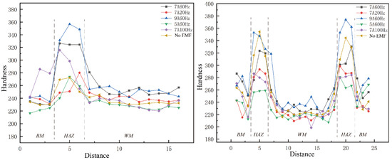 When transverse hardness measurements are performed, the hardness in the WM is slightly lower than in the BM. However, the hardness of the WM varies under the action of different parameters of the EMF. The effect of the excitation current on the weld hardness is more obvious, with a fixed excitation frequency of 60 Hz, and the hardness is higher than that of the weld without the EMF, except that the hardness is slightly lower when the excitation current is 5 A. The maximum hardness is lower than that of the BM when the magnetic field is applied. The maximum hardness without the EMF is 226.6 HV0.5, while the maximum hardness of the weld at 9 A/60 Hz reaches 248.8 HV0.5, which is an increase of 9.80%. By fixing the excitation current at 7 A, it is found that the change in the frequency has little effect on the hardness, and there is little difference between the weld hardness under different excitation frequencies and that without an EMF.