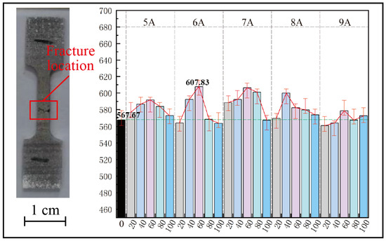 On the other hand, tensile sampling of the specimen was carried out, as shown in Figure 11a, and a fracture occurred in the WM for different parameters. The appearance and tensile strength of the specimen after pull-off are shown in Figure 14. It follows that the tensile strength of the weld changes after the ELMF is applied, showing an overall increasing trend. The tensile strength without an magnetic field is 567.67 MPa (95% confidence interval is [559, 579] MPa), and the tensile strength reaches a maximum value of 607.83 MPa (95% confidence interval is [595, 615] MPa) at an excitation parameter of 6 A/60 Hz, which is an increase of 7.07% in comparison. Under the condition of a constant excitation current, the weld tensile strength shows a single peak distribution with the increase in excitation frequency. The weld tensile strength is highest at a frequency of 60 Hz, after which the tensile strength gradually decreases with the increase in frequency. At the same frequency, the higher tensile strength is obtained at a medium excitation current, and the tensile strength obtained at a 7 A excitation current is better than other parameters.