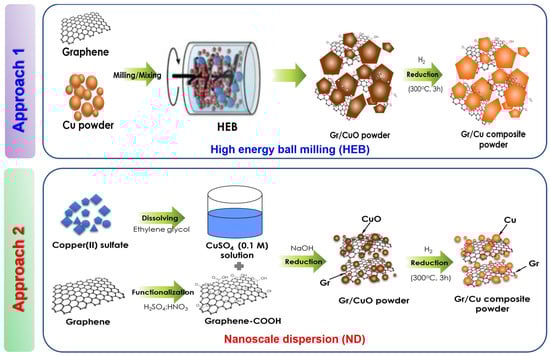 Preparation of Gr/Cu powder: Gr/Cu powders containing 2 vol.% Gr was prepared by using two different approaches including high-energy ball milling (HEB-Approach 1) and nanoscale dispersion (ND, Approach 2) as shown in Figure 1.