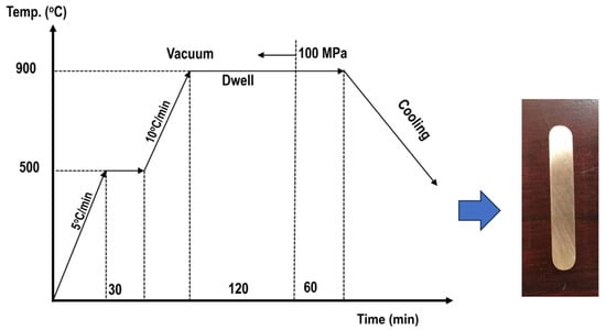 Sintering process: The sintering process of Gr/Cu composite material is described in Figure 3. Hot iso static pressing (AIP6-30 H, American Isostatic Presses Inc., Columbus, OH, USA) were used to consolidate the Gr/Cu composite specimens. Firstly, the prepared Gr/Cu powder was pre-compacted to form bar-shaped samples with dimensions of 40 × 10 × 3 mm. The specimens were then put in the chamber and heated (5 °C/min) up to 500 °C and held for a 30 min dwell time, followed by increasing the temperature to 900 °C (10 °C/min) and applying the pressing process under a load of 100 MPa for 120 min to obtain Gr/Cu composite.