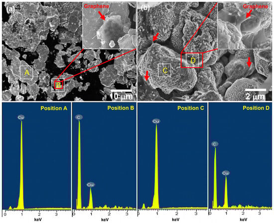 The microstructure of composite powders prepared by different dispersion techniques is shown in Figure 4. Figure 4a is a Gr/Cu powder prepared by the HEB technique. As observed in the figure, Gr is dispersed on the surface of deformed Cu particles during the milling process. However, the appearance of Gr clusters is also observed in the Cu matrix. This indicated that the HEB technique is less effective in dispersing Gr. Figure 4b shows the morphology of Gr/Cu powder prepared by the ND technique. The obtained results showed the ability to evenly disperse Gr and Cu particles during the preparation process. This is attributed to the formation of Cu nanoparticles on the surface of Gr sheets. The Gr sheets are surface modified with COOH functional groups at the boundary. These functional groups will interact with Cu2+ ions. Then, the chemical reduction process is carried out and Cu nanoparticles are formed at the positions of the functional groups. This process helps to disperse Cu particles more uniformly than the HEB technique. The presence of Gr in the powder was confirmed by EDS spectra at position B for the powder prepared by the HEB technique and position D for the powder prepared by the ND technique.