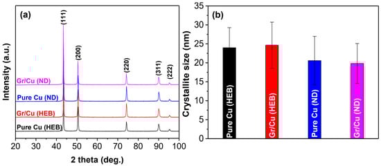 (a) XRD patterns and (b) crystallite size of pure Cu and Gr/Cu with powder prepared by HEB and ND techniques.