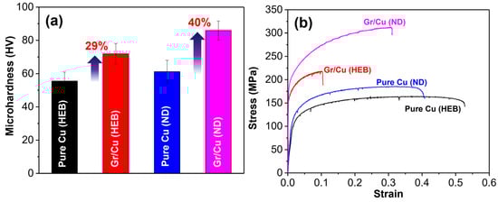 (a) Microhardness and (b) tensile strength of pure Cu and Gr/Cu with powder prepared by HEB and ND techniques.