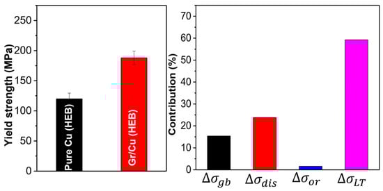 Contribution of strengthening mechanisms to the yield strength of Gr/Cu composites with powder prepared by HEB technique.