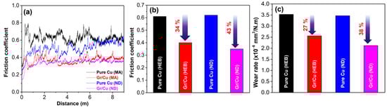 (a,b) Friction coefficient and (c) wear rate of pure Cu and Gr/Cu with powder prepared by HEB and ND techniques.