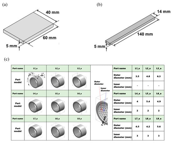 Figure 1a,b show specimens for evaluating wear characteristics and mechanical strength after binder jetting and Cu infiltration. Figure 1a shows the specimen’s shape for the ball-on-flat wear test, and Figure 1b shows the specimen model for the tensile test, which was processed into a standard specimen and evaluated.