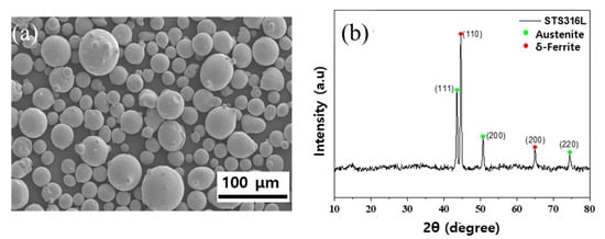 Figure 2 shows the particle size distribution, particle morphology, and XRD analysis results of the powder. The delta ferrite phase is observed in the XRD measurement results due to the atomization process of high-temperature melting and rapid cooling. As the Cr-Ni equivalent in the composition decreases, delta ferrite is formed, and the formed ferrite reverts to austenite due to the rapid cooling rate. It is believed that austenite and ferrite coexist even after cooling to room temperature due to failure to transform. These results are based on a study by Laxminarayana et al. [], who studied the formation of delta ferrite in austenitic stainless steel casts, including 316L and 304, and based on gas atomization and plasma spheronization treatment to produce 304L spherical powder for the SLM process. This is in good agreement with the study by Sehhat et al. []. According to these authors, the melting process can change into austenite–ferrite solidification mode or ferrite–austenite solidification mode depending on the change in chromium–nickel equivalency, and the generated ferrite cannot be transformed back into austenite under a fast cooling rate, so it can be stored at room temperature. It is reported that even after cooling, austenite and ferrite coexist.