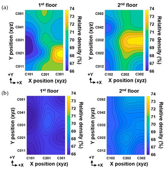 Figure 3 displays a heat map based on measured density by location on the powder bed. Figure 3a shows that the bed density is not uniform when using full-range powder (particle size range of 125 μm or less) manufactured through gas atomization. In contrast, Figure 3b shows that powders with particle sizes of 15–106 μm exhibit a uniform powder bed density. This indirectly shows that a stable process is possible even with cheaper powder (with a wide particle size range) than the powder used in the existing BJT AM process.
