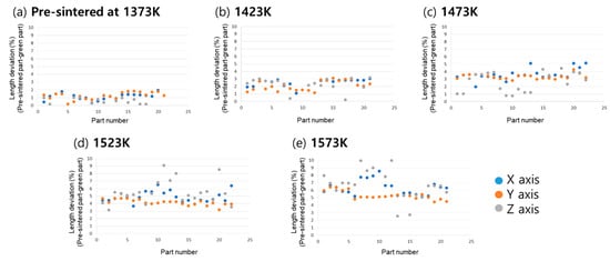 Length deviation of each axis after pre-sintering processes: (a) deviation of 1373 K pre-sintered part to green body part, (b) deviation of 1423 K pre-sintered part to green body part, (c) deviation of 1473 K pre-sintered part to green body part, (d) deviation of 1523 K pre-sintered part to green body part, and (e) deviation of 1573 K pre-sintered part to green body part.