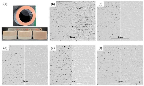 Macroscopic images and microstructure images before/after molten Cu infiltration process (BSE mode): (a) macroscopic images before/after infiltration, (b) pre-sintering part at 1373 K/Cu infiltration part, (c) pre-sintering part at 1423 K/Cu infiltration part, (d) pre-sintering part at 1473 K/Cu infiltration part, (e) pre-sintering part at 1523 K/Cu infiltration part, and (f) pre-sintering part at 1573 K/Cu infiltration part.