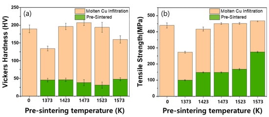 Mechanical properties of pre-sintered and Cu-infiltrated specimens. (a) Vickers hardness test. (b) Tensile strength.