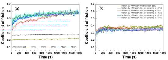 Wear testing under all process conditions: (a) ball-on-flat friction coefficient measurement result for each pre-sintering process condition and (b) ball-on-flat friction coefficient measurement result for molten Cu infiltration after pre-sintering.