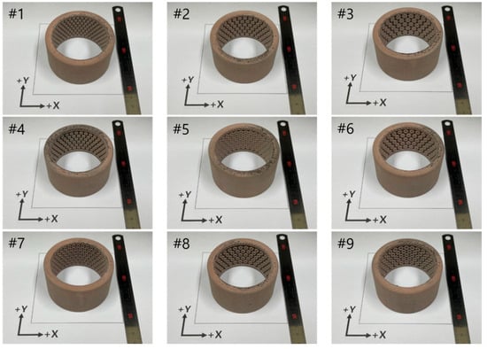 As a result of combining the results of each characteristic, the conditions of pre-sintering at 1473 K and then Cu infiltration were selected as post-process conditions suitable for manufacturing journal bearings. Figure 8 shows nine journal bearing parts manufactured through the BJT AM process based on the model in Figure 1 and then pre-sintered at 1473 K and infiltrated with Cu. The excavator rig testing results show that the journal bearings manufactured by BJT AM exhibited superior wear resistance and load-bearing capacity compared to commercial products. The specimen that showed the best mechanical properties was specimen #9, which had an internal dimple on the internal pattern protrusion with an inner diameter of 3 mm and an outer diameter of 5.6 mm. In particular, the developed bearings were found to have higher wear resistance and load-bearing capacity compared to existing commercial products. The wear amount and load-bearing capacity of the developed product (#9) were 0.11 mm and 117.7 N/mm2, respectively, which were both superior to the 0.65 mm and 68.6 N/mm2 values of the commercial product.