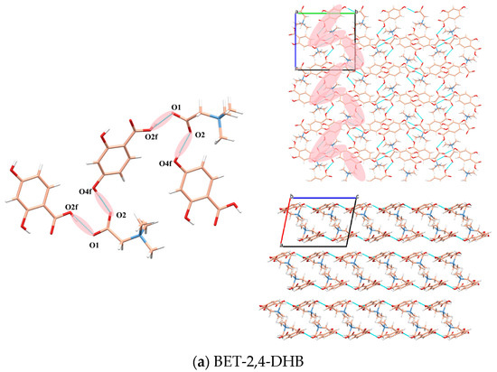 The crystal structure of BET-2,4-DHB comprises a unit cell with two BET molecules and two 2,4-DHB molecules. As shown in Figure 1a, the O1 of BET forms a hydrogen bond with the O2f of one 2,4-DHB molecule, and the O2 of BET forms a hydrogen bond with the O4f of another 2,4-DHB molecule, resulting in the formation of a “Z”-shaped chain arrangement of BET and 2,4-DHB. On the a-axis, the pink area of Figure 1a shows a “Z”-shaped chain, which extends along the c-axis. However, there are no obvious hydrogen bonding connections among the chains in the b-axis.