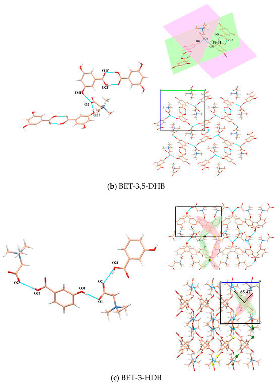 A unit cell of the BET-3-HDB crystal structure has two BET molecules and two 3-HDB molecules. Similar to the structure of BET-2,4-DHB, O1 and O2 of one BET molecule form hydrogen bonds with two 3-HDB molecules of O3f and O2f, respectively, forming a chain structure. On the c-axis, the two chains labeled in pink and green are symmetrically oriented along the a-axis. The two planes in which the 3-DHB molecules on the two chains of symmetry are located form 85.47° on the a-axis.