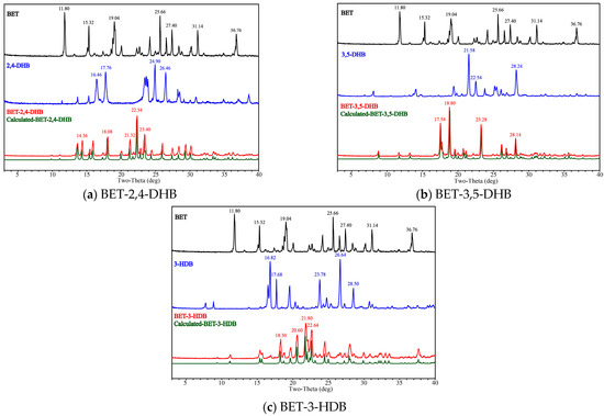 A standard method for structure determination and phase identification, PXRD provides kinematic and complete data sets that can be collected easily and quickly [49]. PXRD is widely recognized as being useful for phase identification due to its phase specificity [50]. Figure 2 illustrates the pure phase of BET, CCFs (2,4-DHB, 3,5-DHB and 3-HDB), and the three co-crystal PXRD patterns as well as the theoretical PXRD patterns (labeled with the prefix “Calculated”) of the co-crystals calculated by Mercury. The X-ray diffraction peaks are correlated with the cell parameters and the intensity of the peaks is determined by the distribution of atoms within the lattice [51]. In comparison with API and CCFs, the peak positions and peak intensities of the three co-crystals present remarkable changes, as shown by the specific peak position values in Figure 2.