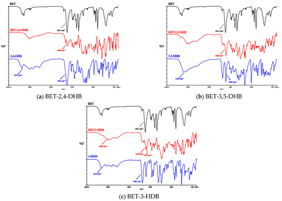 The primary locations in the COO⁻ structure where BET produces hydrogen bonds are indicated by SCXRD analysis. The COO⁻ structure of BET has a multi-electronic π-bonding system, in which the negative charge on the oxygen is not collected on one oxygen but dispersed on two oxygens and one carbon, showing an averaged structure. The IR spectral wavenumber bands of the COO structure of BET are within the range of 1550–1650 cm−1. The IR spectral wavenumber of -COOH and -OH of CCFs participates in the formation of hydrogen bonds in the range of 3450–3200 cm−1 and 1900–1630 cm−1. When hydrogen bonds are formed, the vibrational frequency shifts towards lower frequencies. In Figure 3, the co-crystals of vibrational frequencies move to lower frequencies or disappear, implying the formation of hydrogen bonds.