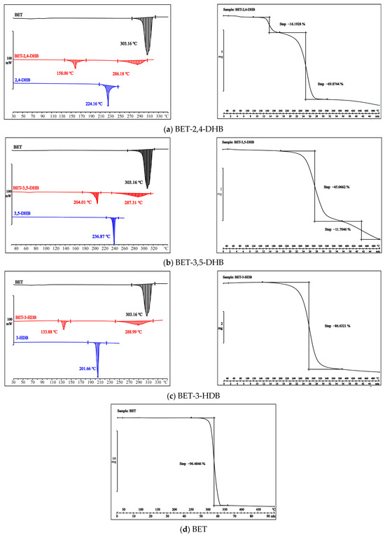 Thermal analysis includes DSC [52,53] and TG. The DSC curves of all three co-crystals display two endothermic peaks distinct from those of API (303.16 °C) and CCFs in Figure 4 (left). This phenomenon is an indication that a new phase may have been created. TG is a thermal analysis technique that analyzes the change in mass (weight/mass change and rate of weight change) of a substance as a function of temperature. TG can be used to detect the crystallization of solvents, the loss of water molecules, sublimation, and so forth. The TG curves of the three co-crystals are displayed in Figure 4 (right). The TG curves of the three co-crystals do not show any weight loss steps of solvent or water molecules, which exactly corresponds to the DSC curves. There are two phases for weight loss in BET-2,4-DHB and BET-3,5-DHB. A partial structural breakdown of weight loss could occur at BET-2,4-DHB’s first weightless phase. The weight loss range of BET-3,5-DHB (210–380 °C) is compatible with the weight loss range of raw BET (250–360 °C), and the first step is 45.07%, which is near to the theoretical weight loss of 43.19% for BET.