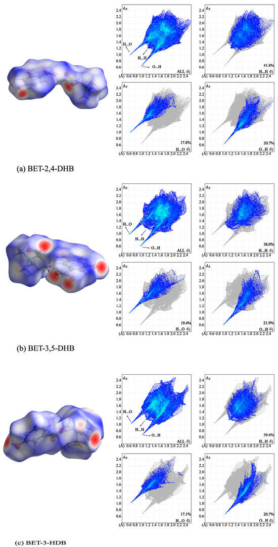 Graphical tools based on Hirshfeld surfaces and two-dimensional (2D) fingerprint maps are valuable for visualizing and analyzing intermolecular interactions. Hirshfeld surface and 2D fingerprint maps, which are developed to visualize the contribution of intermolecular interactions in BET-2,4-DHB (a), BET-3,5-DHB (b), and BET-3-HDB (c) co-crystals, are presented in Figure 5. The dark red spots indicate the locations where hydrogen bonds are formed, and the shade of color corresponds to the strength of the interaction on the Hirshfeld surface. BET mainly acts as a hydrogen bonding acceptor, while CCFs (2,4-DHB, 3,5-DHB and 3-HDB) act as both hydrogen bonding acceptors and hydrogen bonding donors. Meanwhile, BET-3,5-DHB displayed more dark red spots with four than the other two co-crystals with two.