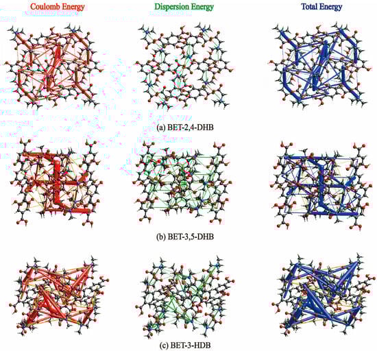 Figure 6 illustrates the 3D energy frameworks of the three co-crystals calculated by the CrystalExplorer 21.3 software, which is utilized to analyze the interaction of energy between molecules. Red is the Coulomb energy, green is the dispersion energy, and purple is the total energy. The cylinder diameter changes according to the magnitude of the interaction force. Due to betaine’s status as a zwitterion, we speculated that Coulomb energy would be the main energy involved in the formation of co-crystals of BET, and the results have been consistent with our speculations. The calculations demonstrate that the red cylinder in the three co-crystals is thicker than the other two colors, implying that Coulomb energy dominates in the three co-crystals.