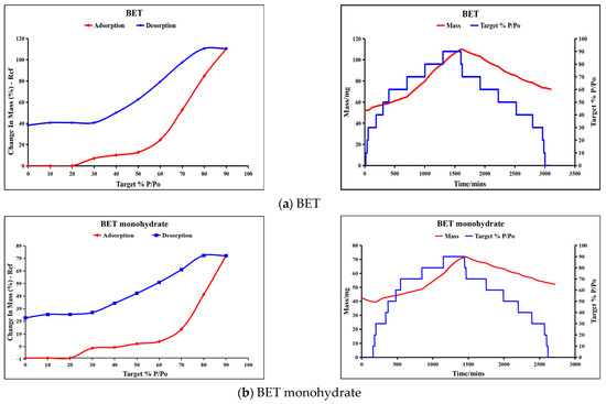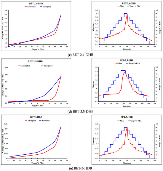 DVS is a gravimetric technique that measures substance weight loss/gain as a function of humidity (RH). The curves of sorption (red) and desorption (blue) for BET, BET-2,4-DHB, 3,5-DHB, and BET-3-HDB are presented in Figure 7.