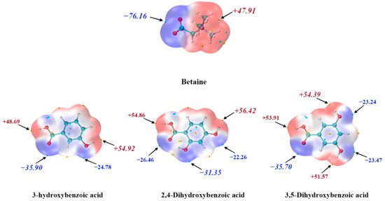 This study presents the synthesis of three co-crystals to reduce the hygroscopicity of BET: betaine-2,4-dihydroxybenzoic acid (BET-2,4-DHB), betaine-3,5-dihydroxybenzoic acid (BET-3,5-DHB), and betaine-3-hydroxybenzoic acid (BET-3-HDB). As shown in Scheme 1, the structures of the three CCFs obtained in this study that form co-crystals with BET are similar to those reported for gallic acid. Gallic acid possesses more hydroxyl groups located in the para and meta positions. The co-crystals were characterized using single-crystal X-ray diffraction (SCXRD), powder X-ray diffraction (PXRD), differential scanning calorimetry (DSC), thermogravimetric analysis (TG), and infrared spectroscopy (IR), and their hygroscopicity was evaluated through dynamic vapor sorption (DVS). We examine co-crystal interaction forces through the application of Hirschfeld surface analysis, energy frameworks, and molecular electrostatic potential surfaces (MEPS).