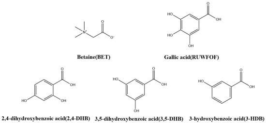 Scheme 1. Chemical Structures of BET, gallic acid (RUWFOF), 2,4-DHB, 3,5-DHB and 3-HDB.