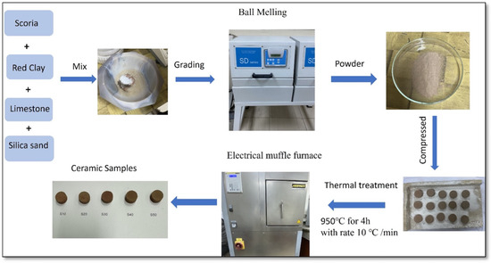 Five ceramic samples were prepared from scoria, red clay, limestone, and silica sand. The scoria content in their composition sample ranged from 10 wt.% to 50 wt.%. The preparation of ceramic batches involved determining the ideal ratios of scoria to red clay. The required amounts of silica and calcium oxide for all mixtures were acquired from silica sand and limestone. The compositions of the ceramic samples were denoted as S10, S20, S30, S40, and S50 in Table 2, and calculated accordingly.