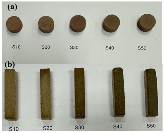 Specimens prepared for the mechanical test from scoria at 950 °C for 4 h. (a) in disc shape and (b) in rectangular shape.