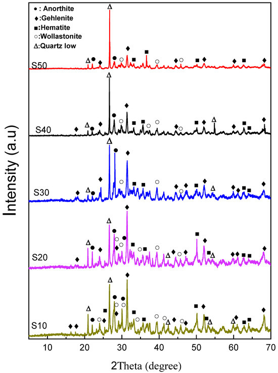 The crystal structures and mineralogical compositions of the ceramic samples S10–S50, were identified by XRD (Figure 3). The cards established by the International Centre for Diffraction Data were used to determine major crystalline phases. As a result, gehlenite (Ca2Al2SiO7) (JSPDS No. 20-199), wollastonite (CaSiO3) (JSPDS No. 10-489), and anorthite (CaAl2Si2O8) (JSPDS No. 20-20), low quartz (SiO2) (JCPDS No. 5-0490), and hematite (Fe2O3) (JSPDS No. 33-664) minerals were detected in all the studied ceramic samples. In particular, it was found that, among the main mineral phases, gehlenite has characterized lines 2.85, 1.75, 3.07, and 5.46 Å, quartz low has defined lines 3.342, 4.257, and 1.817 Å, and anorthite has characterized lines 3.19, 3.18, and 3.21 Å. In addition, the wollastonite phase has identified lines 2.97, 3.83, 3.52, and 3.31 Å, and hematite has represented lines 2.700, 2.519, 1.694, and 1.840 Å; these were present as minor phases in all investigated samples. It can be noticed that the content of quartz increased, while the gehlenite and anorthite concentrations decreased from the S10 to S50 samples. Gehlenite, quartz, and anorthite were found to be the main phases from S10–S20. The phases of mineral quartz started to increase from sample S30 and were the main phase in sample S50, whereas the phases of mineral gehlenite and anorthite decreased. With the increase in scoria, the intensities of low quartz, gehlenite, and anorthite peaks increased slightly. In S40 and S50, the intensity of the low quartz peak increased while the intensities of gehlenite and anorthite peaks decreased.