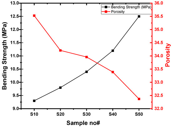 The bending strength of the ceramic samples is presented in Figure 4. It was found that bending strength increases with the increasing amount of scoria in the samples, reaching a maximum value of 12.50 MPa. The increase in the bending strength value of ceramic is due to the reduction in porosity as shown in Figure 4. Porosity leads to stress concentration and a decrease in the load-receiving area. These findings are consistent with previous studies [35,36].