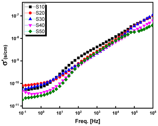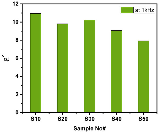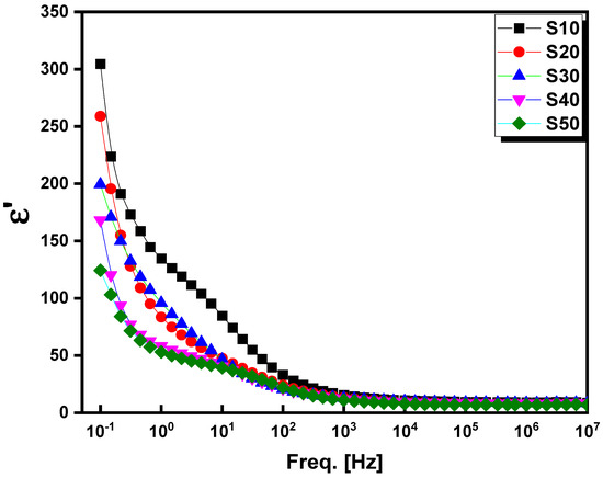 where εo = 8.85 × 10−12 F/m is the free space permittivity, d is thickness, and A is the electrode area. The frequency dependence of the dielectric constant (ε′) of the ceramic samples prepared at 950 °C for 4 h is shown in Figure 5. Two distinct behaviors can be observed. The first behavior started from 0.1 Hz up to 104 Hz, in which the curves of the dielectric constant (ε′) sharply decreased with increasing frequency for all ceramic samples. This result is attributed to the superposition of the interfacial polarization [38,39], which is commonly found in heterogeneous materials, as well as the contribution of charge carrier transport, leading to increased conductivity. Moreover, in this range (<104 Hz), the value of the dielectric constant decreased from sample S10 to S50 as the scoria content increased. Table 3 shows the calculated values of the dielectric constant (ε′) for selected frequencies, which demonstrates that the dielectric constant decreased with increasing frequencies and became almost frequency-independent over 103 Hz. As the scoria concentration increased from sample S10 to S50, the (ε′) value decreased from 15.49 to about 11.87 at 103 Hz, as shown in Figure 6. Sample S50 exhibited the lowest (ε′) value of 11.07. The second behavior is observed from 104 Hz to higher frequencies, where the dielectric constant curves showed no significant alterations with increasing frequencies. In this range, the dielectric constant appears to be frequency-independent for all samples. Furthermore, for all samples, the dielectric constant values appear to be similar at high frequencies, and the increasing scoria concentration has a negligible influence on it. This outcome can be attributed to the fact that, at higher frequencies, the polarization or charge carrier hopping mechanisms exhibit a lag with the applied electric field frequency [40,41]. This is because the applied field changes at a much faster rate than the dynamic response of the samples [42]. Therefore, as the content of scoria increased, the dielectric constant became less dependent on the frequency and the scoria content.