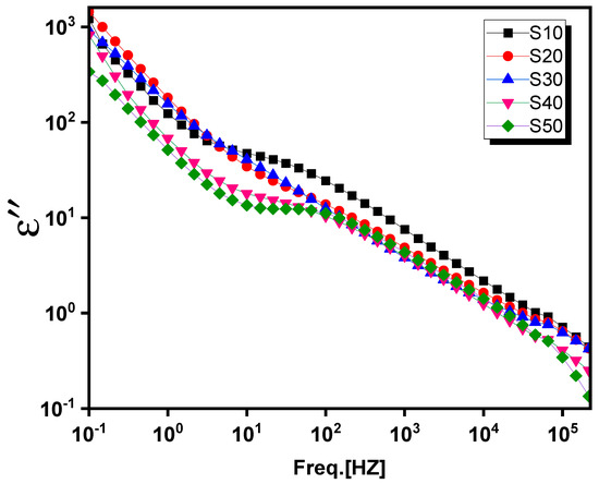 The dielectric loss (ε″) and electric modulus loss (M″) were investigated for all samples in this study, as these parameters indicate the loss of energy in a material as heat and/or leakage current. Figure 9 and Figure 10 present the frequency-dependent behavior of these losses. The dielectric loss decreased with increasing frequency for all samples. At low frequencies, ion hopping, charge carrier immigration, and ion or dipole polarization in the material caused dielectric loss. In contrast, at high frequencies, the dipoles froze and ion vibrations were the only way for dielectric loss to occur. Consequently, as frequency increased, the dielectric loss decreased [45]. Nevertheless, as the scoria content increased from sample S10 to S20, the dielectric loss decreased. However, there was no discernible change in dielectric loss from S20 to S50. This means that any contribution from polarization dynamics is being overshadowed by the impact of charge transport processes.